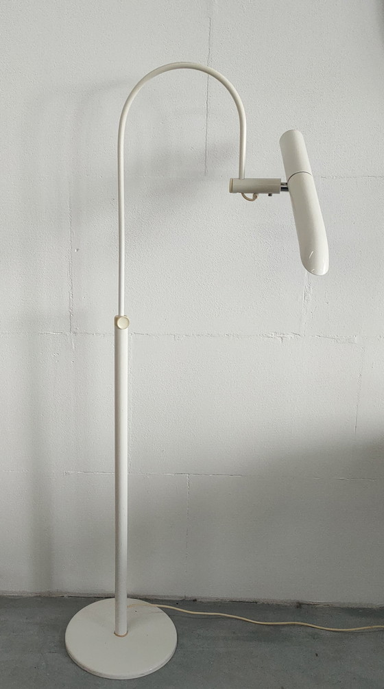 Unieke witte boog- vloerlamp uit de space age periode (jaren 50-begin 70). De booglamp is in hoogte verstelbaar (114 cm-144 cm), het 'space shuttle achtig' verlichtingsdeel is tevens draaibaar in diverse hoeken en standen. De lamp wordt qua design toegeschreven aan P.J. Copini, ook Sölken Leuchten dat in de jaren 50 is opgericht wordt wel eens als fabrikant geduid. Waarbij ook werd samengewerkt met Massive uit België. Koch & Lowy wordt ook door diverse bronnen aangegeven als ontwerper, wij zijn van mening dat dit echter niet het geval is. Er worden tevens verwijzingen gemaakt naar ontwerpen van Roger Tallon (franse designer) waarvan zijn ontwerpen van lampen verassende overeenkomsten vertonen met deze lamp. Desalniettemin een schitterende lamp die als designobject ook een gespreksonderwerp in uw woonkamer zal zijn. Aanvullende afmetingen: het verlichtingsdeel/space shuttle achtige deel is 43 cm lang en 5 cm in doorsnede. De voet is 30 cm in doorsnede. De totale breedte van de lamp is ongeveer 75 cm (dat is de ruimte die het minimaal vraagt).