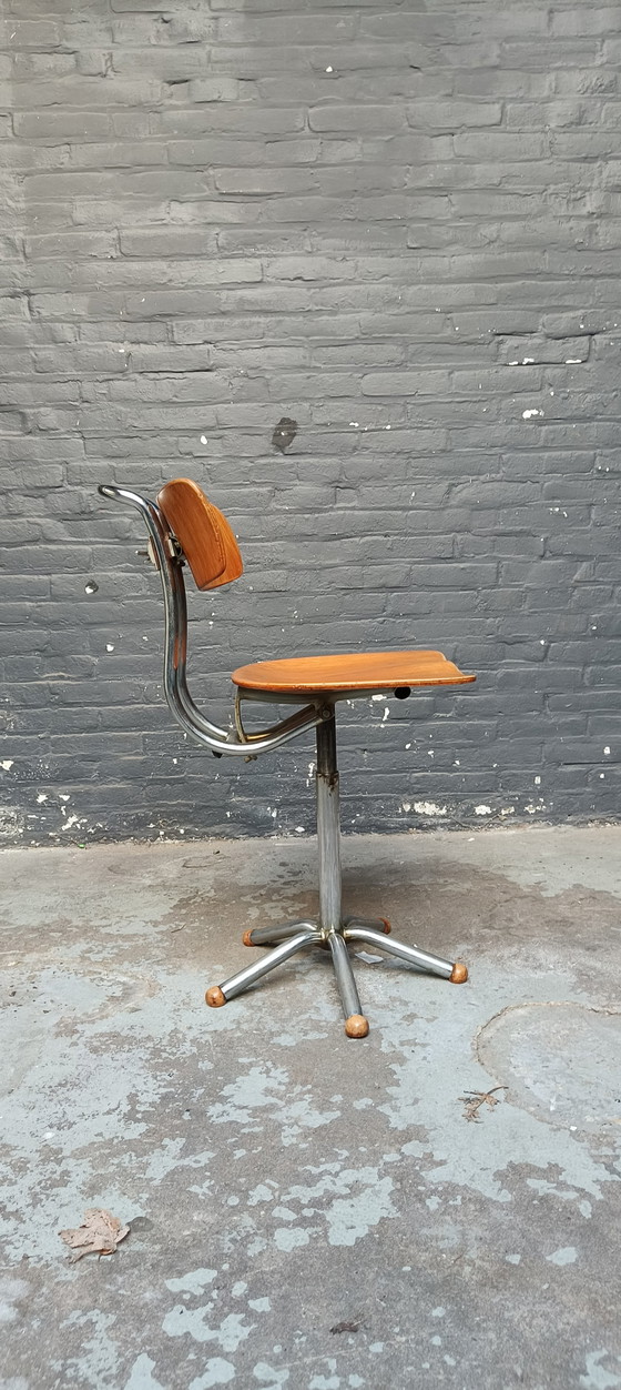 Ontdek de charme van de jaren 50 met deze zeldzame industriële stoel, ontworpen door de Gebr. de Wit uit Schiedam, Holland. Deze stoel, met zijn iconische buizenframe en houten zitting, is een prachtig voorbeeld van Bauhaus design. De verstelbare rugleuning biedt zowel comfort als stijl, waardoor het een ideale keuze is voor aan een tafel of tekentafel. Een must-have voor liefhebbers van industriële vormgeving. De plywood zitting en rug zijn prachtig gebogen en in een goede staat.