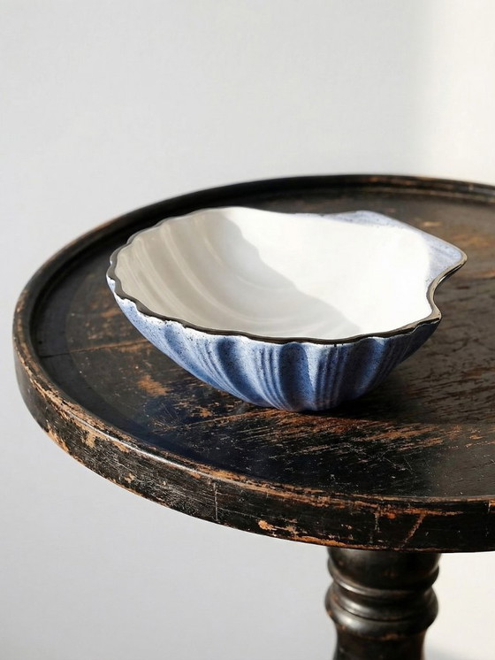 Schitterend en zeldzaam groot sieradenbakje van Christian Dior, uit de vintage collectie van Dior Maison uit de jaren 80, waarschijnlijk een editie uit 1987 van een model uit 1985. Diep schelpvormig, vervaardigd uit zeer lichtgewicht, fijn gevormd keramiek. Prachtige blauwe afwerking met chroomzilveren spikkels, wat een levendig metallic effect geeft, geaccentueerd door een zilveren rand. Glanzend witte binnenkant, een elegant contrast. Onder de voet staat de markering Christian Dior P9812-87, met het gegoten nummer P/98.