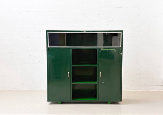 Zeldzame metalen kast van de Italiaanse fabrikant Arredamenti Metallici Meneghello uit Thiene (Vicenza), afgewerkt in donkergroene lak met een karakteristiek glazen schuifvak aan de bovenzijde. De binnenkant biedt voldoende opbergruimte met variabele vakverdeling, kenmerkend voor robuust industrieel en werkplaatsmeubilair uit deze periode.