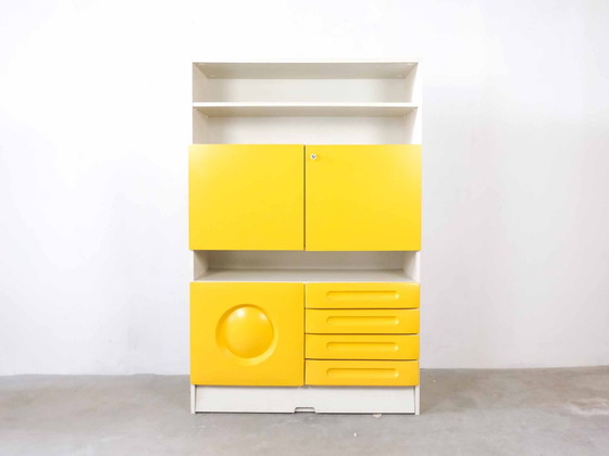 Stap in de toekomst met deze zeldzame Space Age kast, een opvallend stuk uit de jaren 1970 van Gwinner, Duitsland. Het gedurfde geel-witte kleurenschema weerspiegelt de essentie van dat tijdperk, waardoor het een opvallende toevoeging is aan elke moderne of retro-geïnspireerde ruimte.