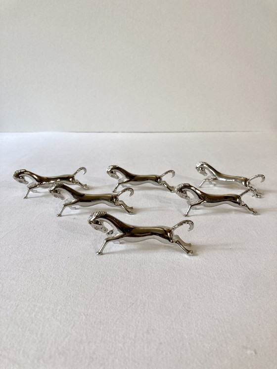 Zes verzilverde metalen messenhouders in de vorm van paarden. Jaren 60.