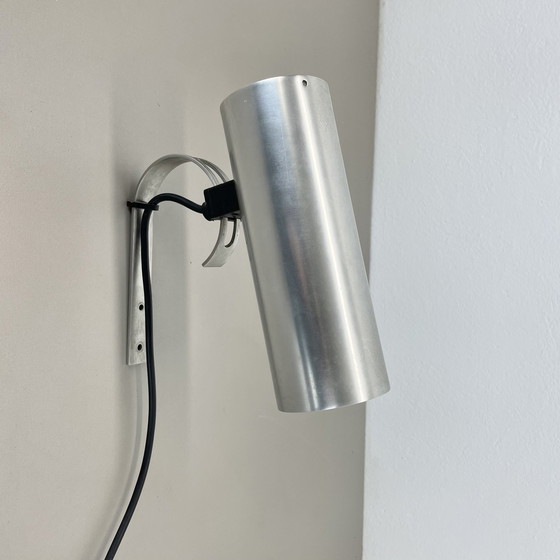 Artikel: wandlamp met 1 lichtpunt Producent: ERCO Lighting, Duitsland Ontwerp: in stijl van Koch & Lowy Herkomst: Duitsland Leeftijd: jaren 1970 Originele jaren 1970 modernistische vintage wandlamp van massief metaal in zilverkleur Deze super zeldzame lamp werd geproduceerd in de jaren 1970 door ERCO Lighting. het ontwerp is zeer minimalistisch en futuristisch, typisch space age design van de jaren 1970.... Het heeft 1 spot element dat individueel kan worden aangepast in verschillende posities.. het licht heeft 1 stopcontacten voor gloeilampen. het licht heeft een schakelelement direct op de kabel. het licht is nog in een goede vintage staat met leeftijd gerelateerde patina, volledig werkend. GEMERKT MET LABEL AAN DE ACHTERZIJDE VAN DE MUURBEVESTIGING. Afmetingen: Lengte 7cm Diepte 20cm Hoogte 19cm