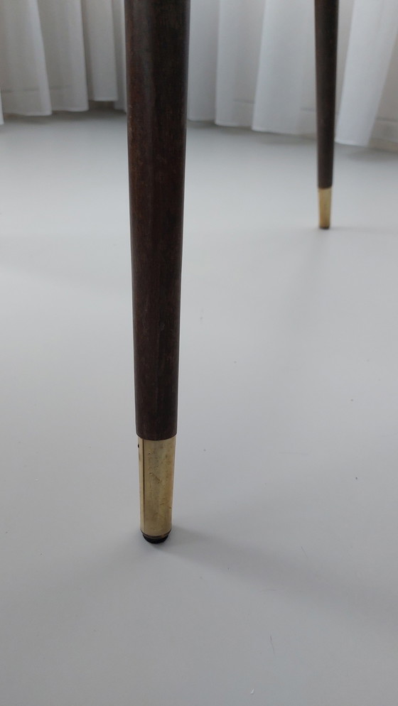 Mooie set vintage stoelen en tafeltje. Tafeltje heeft messing afwerking aan de pootjes. Stoelen hebben een lage maar mooie zithoogte. De zittingen hebben wat aandacht nodig qua spiralen. Deze zijn niet gebroken maar door gebruik mogelijk vervorming ondergaan.