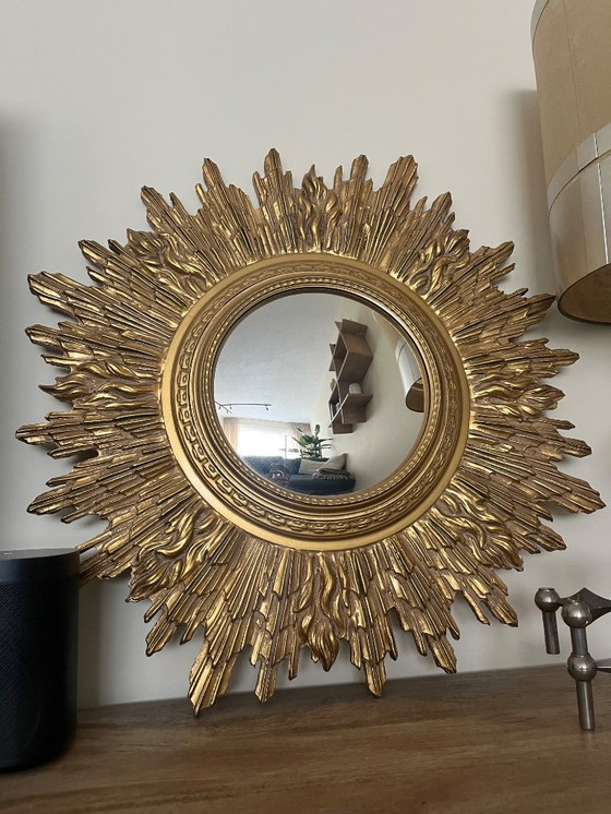 Deze prachtige zonnespiegel, met een diameter van ongeveer 60 cm, is een schitterend voorbeeld van vintage design. Het gouden frame straalt elegantie uit en voegt een vleugje verfijning toe aan elke ruimte.
