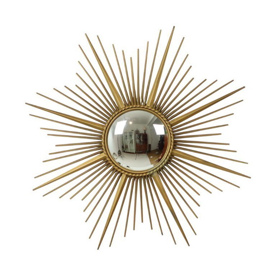Prachtige en indrukwekkende vintage zonnespiegel, iconische sunburst spiegel door topmerk Chaty Vallauris, spiegel gemaakt uit goudkleurig metaal met een convex spiegelglas, achteraan gemerkt, Feronnerie Chaty gelegen in Vallauris, Frankrijk circa jaren 1950-1960.