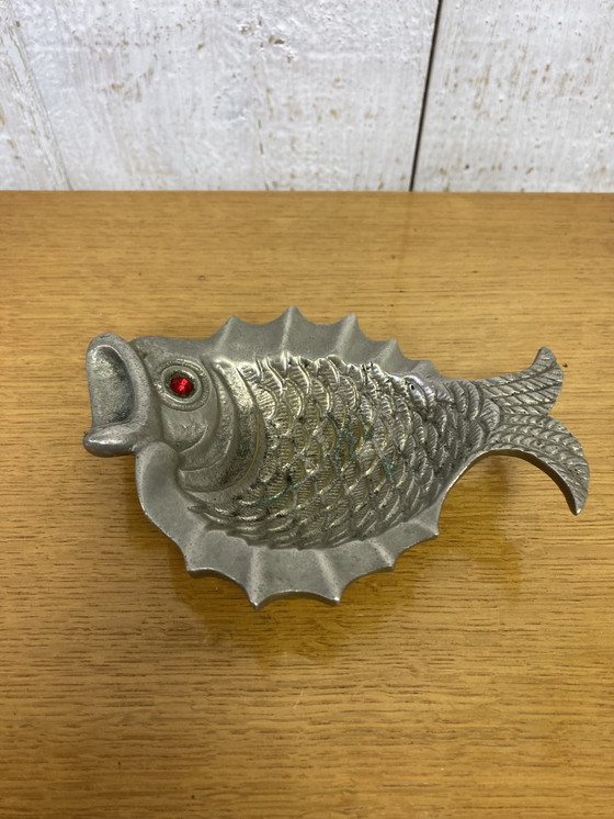 Prachtige asbak uit de jaren 70 in de vorm van een vis. Hij is gemaakt van verguld metaal en valt vooral op door zijn robijnrode oog. Hoogte 32cm, breedte 13cm, diepte 10cm.