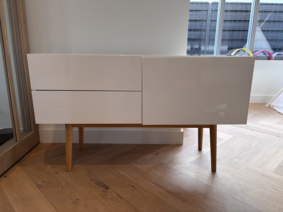 Stijlvol Zuiver High on Wood dressoir, perfect als TV-meubel of opberger. Wit MDF met houten poten. Gebruikt, maar in goede staat (licht scheef deurtje). Ideaal voor kleinere ruimtes. Afmetingen: 90x40x80 cm.