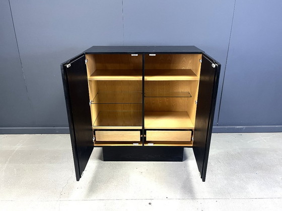 De kast heeft twee deuren en biedt veel opbergruimte met mooie glazen planken en twee lades.