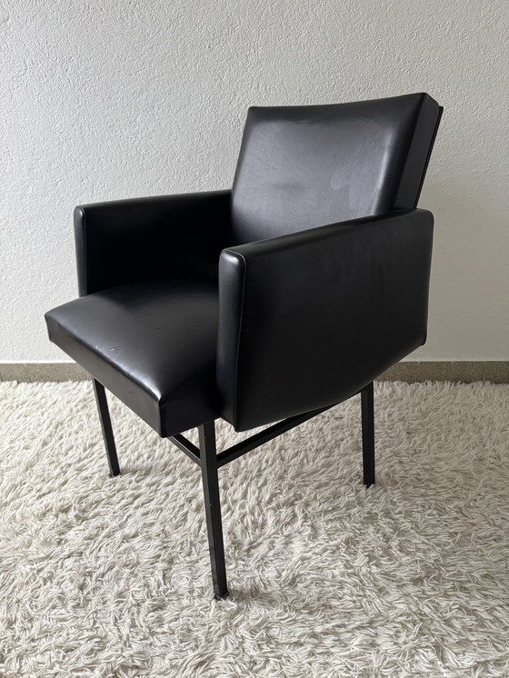 Leuke design fauteuil uit de jaren 50/60 in de stijl van Pierre Guariche in originele zwarte Skaï en metalen structuur; goede algemene staat (enkele redelijke tijdsporen: zie foto's) Hoogte: 84cm Zithoogte: 47cm Breedte: 60cm Diepte: 57cm