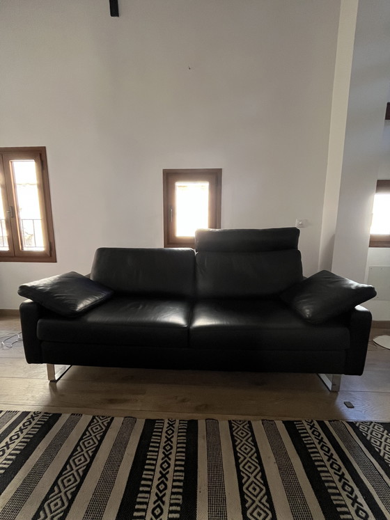 Zwarte leren bank, model 286, van Cor Conseta, staand model. De bank is 204 cm breed en 85 cm diep. De poten zijn van verchroomd metaal. Twee armleuningkussens en een hoofdsteun zijn inbegrepen. De oorspronkelijke prijs voor dit model was meer dan € 10.600. De bank is in zeer goede staat.