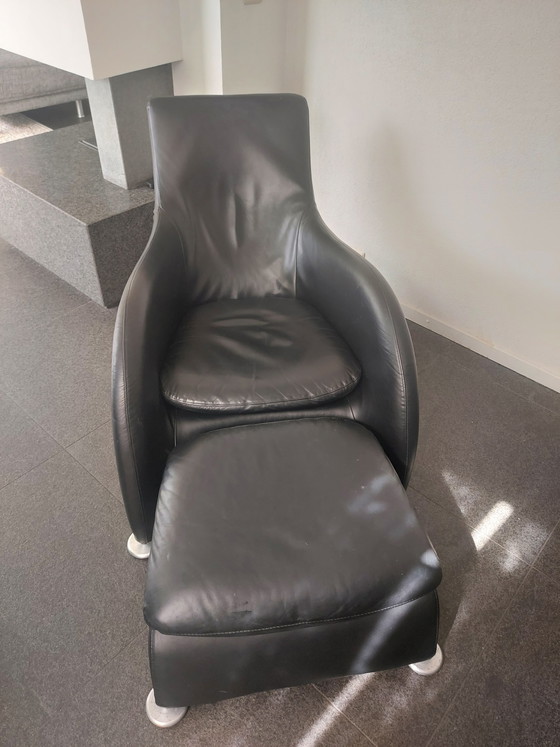 Ervaar ultiem comfort met deze zwarte leren fauteuil van Montis, compleet met bijpassende hocker. Deze stoel nodigt uit om heerlijk in weg te kruipen en biedt een stijlvolle toevoeging aan uw interieur.