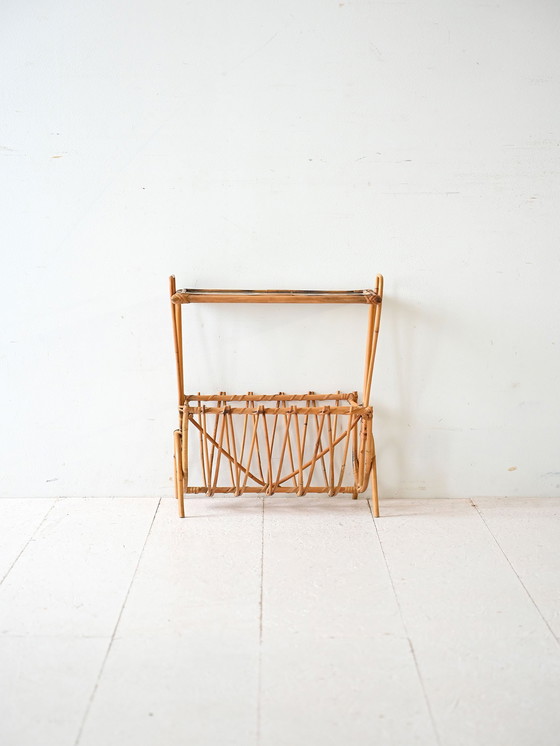 Dit vintage Zweedse tijdschriftenrek van bamboe combineert de natuurlijke charme van bamboe met de moderniteit van mat glas. De essentiële lijnen en het glazen blad voegen een vleugje lichtheid en verfijning toe, waardoor het ideaal is voor minimalistische ruimtes. Perfect als functioneel en stijlvol decoratief object. Goede staat. Kan ouderdomssporen vertonen. Let op de foto's.
