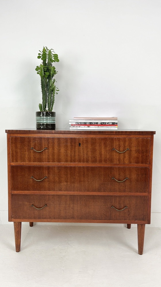 Deze vintage ladekast is uitgevoerd in teakhouten fineer en heeft een warme, klassieke uitstraling. De kast beschikt over drie ruime lades met elegante, houten greepjes en staat op een stevig houten onderstel met slanke, taps toelopende poten.