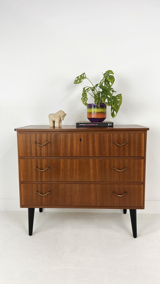 Charmante ladekast uit Zweden, uitgevoerd in warm mahonie fineer met fraaie houttekening. De kast is voorzien van drie ruime lades met elegante metalen greepjes en staat op zwart gespoten, slanke poten die het geheel een luchtige uitstraling geven.