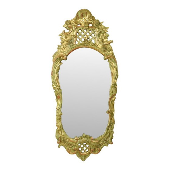 Grote Zweedse spiegel gemaakt uit met bladgoud verguld hout, klassieke kuifspiegel volledig in rococo stijl, elegant gedecoreerd met acanthusbladeren, bloemen en patronen, achteraan gemerkt met de makers sticker, door AB Exportlist, Nyköping, tweede helft van de 20ste eeuw.