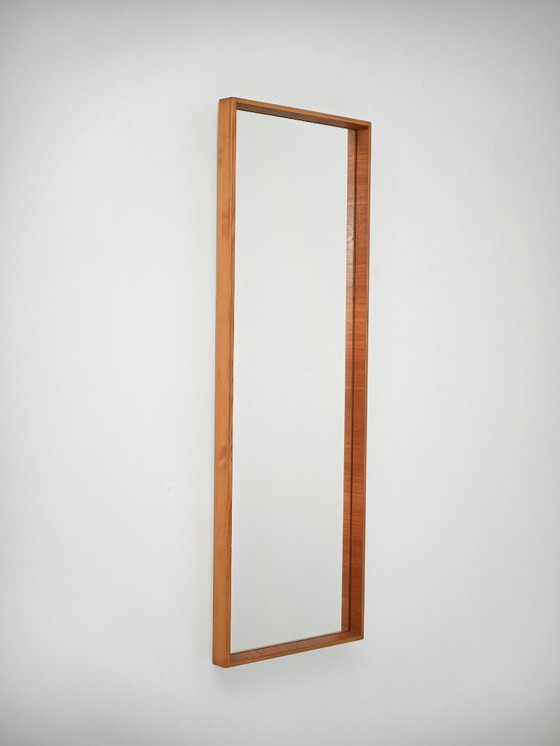 Deze Zweedse spiegel uit de jaren 60, toegeschreven aan Arne Wahl Iversen, heeft een hoge, rechthoekige vorm en een verfijnd teakhouten frame. Het frame heeft een strak geometrisch profiel met een licht verzonken gedeelte dat een elegant diepte-effect creëert rond het spiegeloppervlak. De warme tint van het teakhout en het zorgvuldige vakmanschap weerspiegelen de balans tussen functionaliteit en verfijning die kenmerkend is voor Scandinavisch design uit die periode.