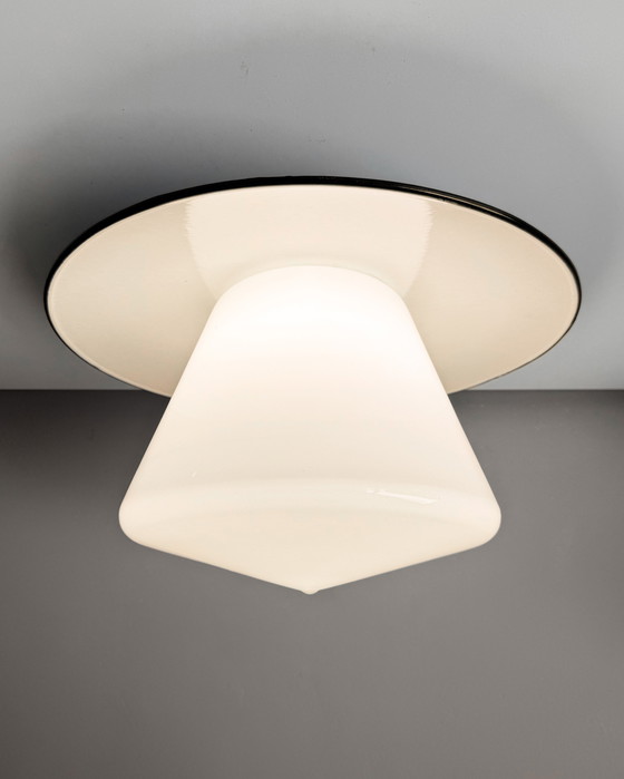 Vintage grote industriële lamp met opaal glazen kap, lichtblauwe geëmailleerde kap met witte onderkant. Geproduceerd in de eerste helft van de 19e eeuw door Sieverts Kabelverk in Sundbyberg, Zweden. In goede staat met gebruikssporen passend bij de leeftijd. Zonder lichtbron en ophangsysteem. Twee beschikbaar, waarvan een een kras heeft op de witte kant van de kap.