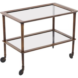 Vintage houten trolley met glazen legplanken, jaren 1950