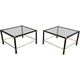 Paar vintage vierkante messing bankeinden met zwart leren omhulsels, 1970