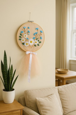 Handgemaakte borduurring - Madeliefjes & Blauwe Wilde Bloemen op Tule met Perzik Tule Staart - 31 cmHandgemaakte borduurring - Madeliefjes & Blauwe Wilde Bloemen op Tule met Perzik Tule Staart - 31 cm