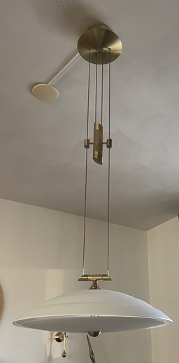 B+M Leuchten Hanglamp in “hoogte verstelbaar” Plafond montage mat/gepolijst messing mat wit gevlamd glas Jaren 90