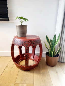 Chinees Houten Krukje of Bijzettafeltje, Laqué Rode Kleur, Versierd Floraal Decor