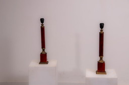 Set lampen in Franse Empire-stijl, gemaakt van amberkleurig bakeliet en messing.