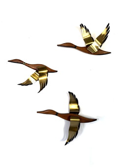 Vintage teak & messing vliegende eenden, jaren ‘60Vintage teak & messing vliegende eenden, jaren ‘60