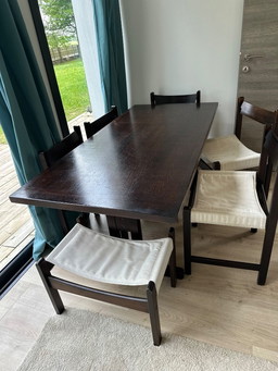 Rustiek modern brutalistisch vintage eetkamerset in gebeitst eiken, België 1970