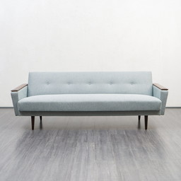 Bank uit de jaren 50 met inklapfunctie, houten armleuningen, volledig gerestaureerd