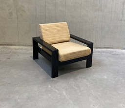 Zwart gelakte fauteuil in brutalistische stijlZwart gelakte fauteuil in brutalistische stijl