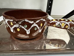 Antiek Digoin Steengoed Caquelon Met de hand beschilderd en geglazuurdAntiek Digoin Steengoed Caquelon Met de hand beschilderd en geglazuurd