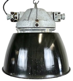 Industriële grijze explosieveilige lamp met zwart geëmailleerde kap, jaren 70