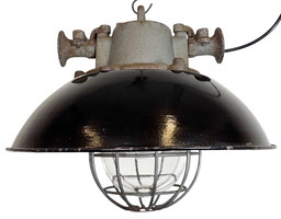 Industriële zwarte geëmailleerde fabriekslamp met gietijzeren bovenkant, jaren 50