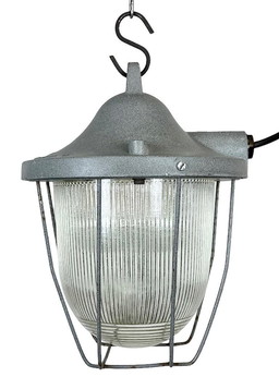 Industriële grijze explosieveilige lamp met zwart geëmailleerde kap, jaren 70
