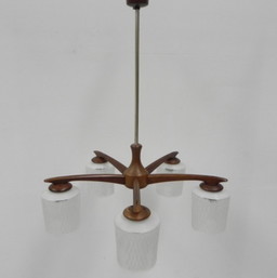 Vintage kroonluchter van teakhout met witte glazen kapjes