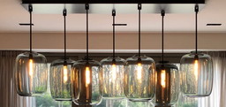Buisvormige hanglamp in gepatineerd en gelakt messing. Eigentijds