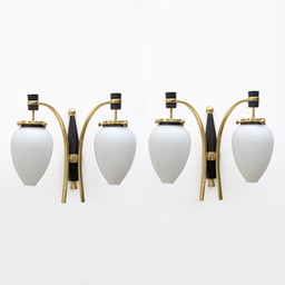 Paar moderne Italiaanse wandlampen van messing en rook Murano glas