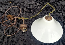 Plafondlamp, Mid Century Modern, Scandinavische Art Deco, Teakhout, Messing, Koper, Opaline Glas, Zeer Zeldzaam