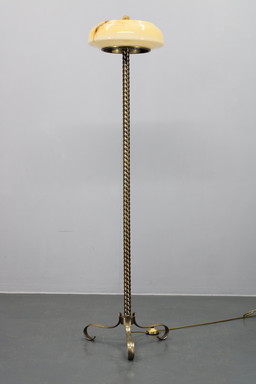Gerestaureerde messing vloerlamp uit 1940 met glazen kap