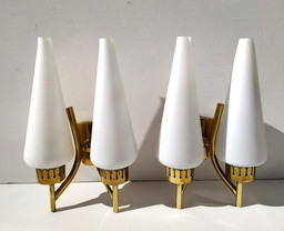 Asymmetrische messing wandlampen met opalen tulpvormige kappen - jaren 50/60