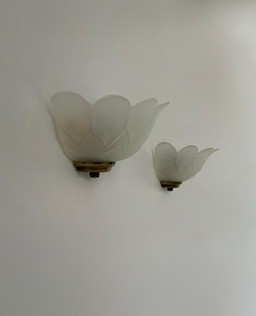 Paar vintage wandlampen van messing en gezandstraald glas, Frankrijk, 1970