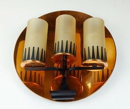 Zeldzame en uitzonderlijke wandlamp uit het midden van de 20e eeuw, SCONCE, Stilnovo-tijdperk, koper, metaal, glas.