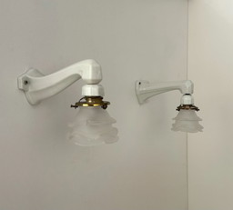 Paar vintage art deco wandlampen, porselein en gezandstraald glas, Frankrijk 1930