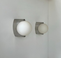 Paar vintage wandlampen, verchroomd metaal en matglas, Frankrijk, 1980