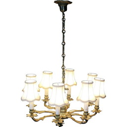 Vintage kroonluchter van messing en witte stof, 1950Vintage kroonluchter van messing en witte stof, 1950