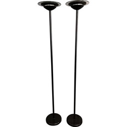 Paar vintage vloerlampen van zwart gelakt metaal en glazen schijf, 1980Paar vintage vloerlampen van zwart gelakt metaal en glazen schijf, 1980