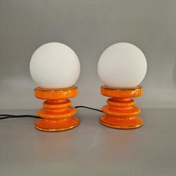 Set van 2 Vintage Tafellampen – Oranje Keramiek & Opaalglas – Space Age Look – E14 – 22 cm Hoog. MCM, 1970s.