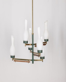 Vintage kroonluchter 1950S in groen metaal messing en glas Italiaans ontwerp